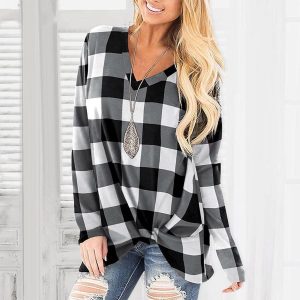 Black Checkered Print V Neck Long Sleeve T Shirt Rotita